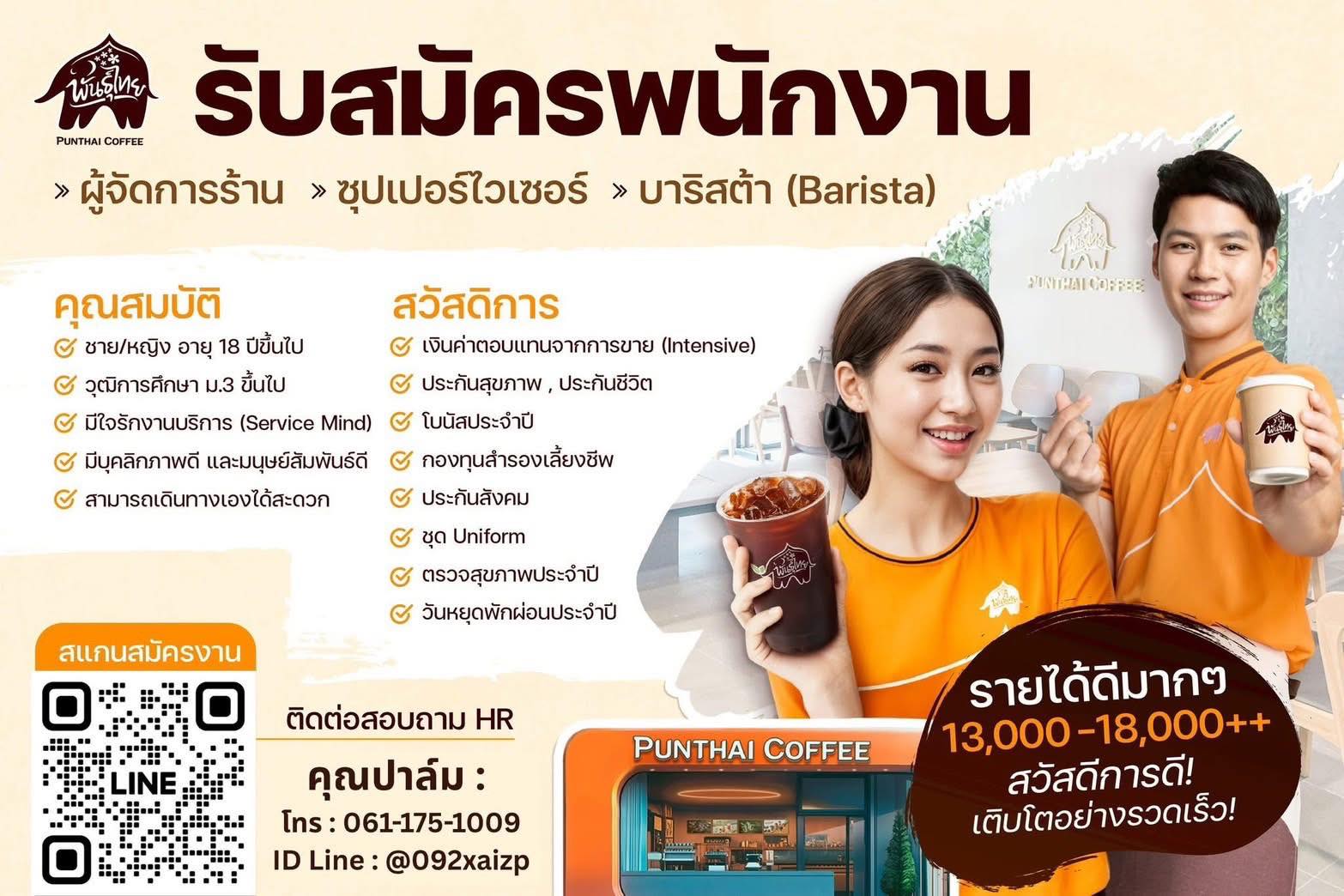 1. สาขาถนนพหลโยธิน (เกาะคา) Supervisor 1 ตำแหน่ง, Barista 1 ตำแหน่ง